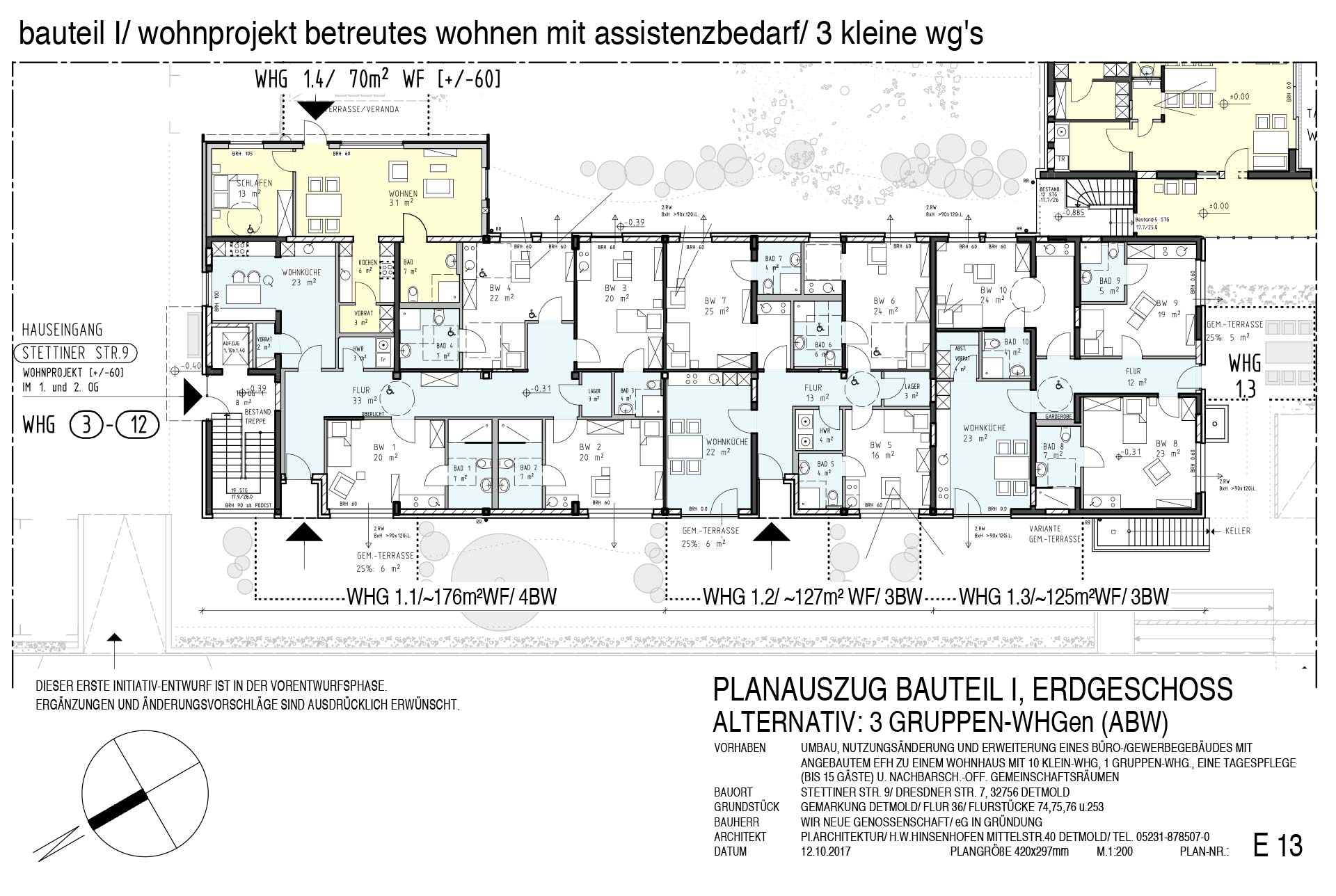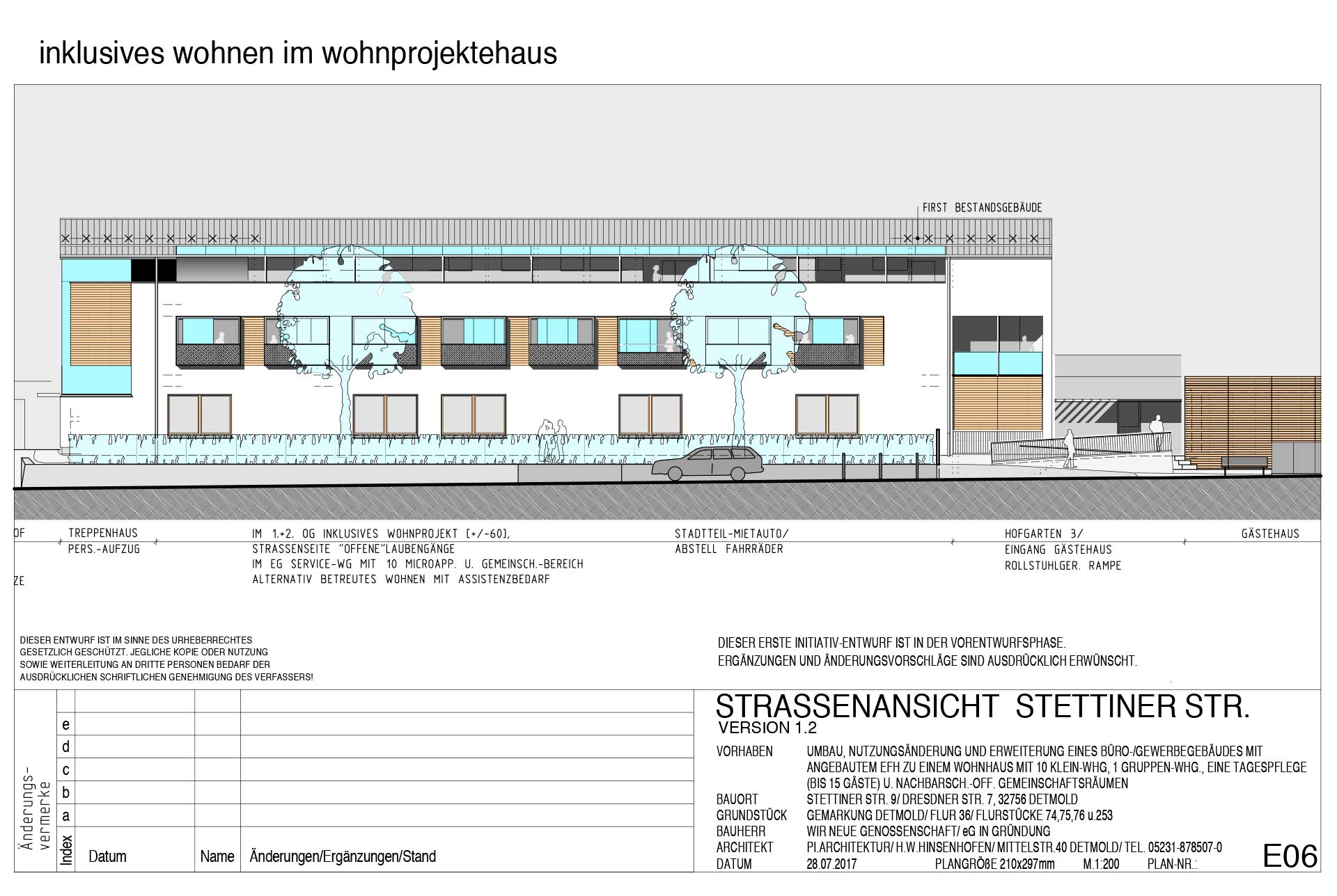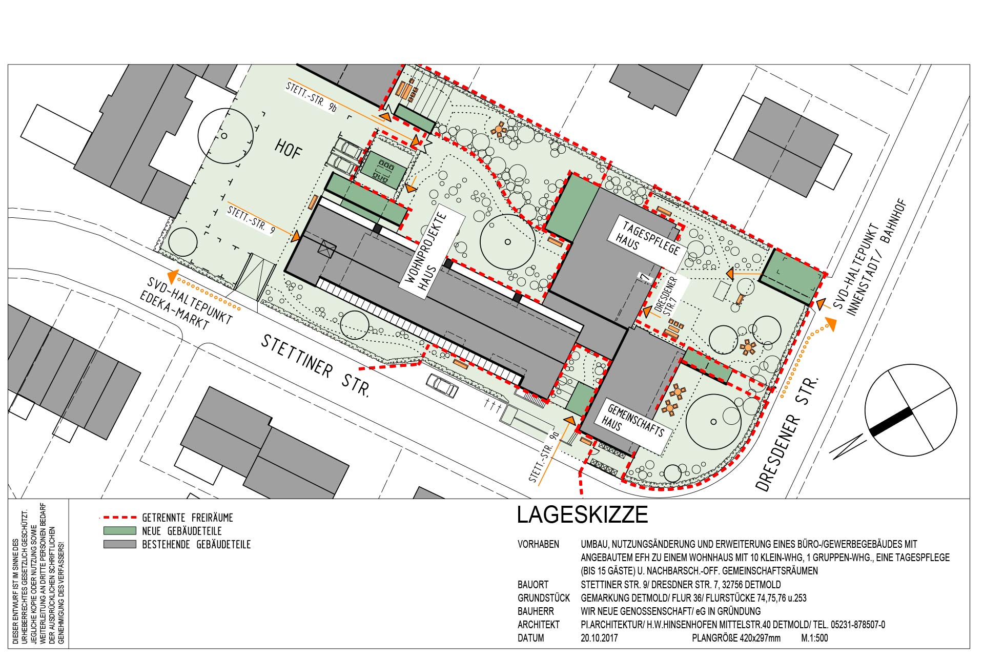Das bestehende, bis 2013 noch genutzte Büro- und Gewerbegebäude, mit angebautem Wohnhaus, mit altem Baumbestand und gewachsenen Gärten, steht mitten im Detmolder Nordviertel auf dem Eckgrundstück Stettiner Straße/Dresdner Straße. Auf Grundlage einer umfassenden Bestandsaufnahme und eines flexiblen Nutzungs- und Grundrisskonzepts konnten Nutzungsalternativen und die individuellen Bedürfnisse und Wünsche der zukünftigen Bewohner noch in die Gesamtplanung einfließen. Geringe Gebäudetiefen und stützenfreie Grundrisse (2-geschossiges Hauptgebäude) ermöglichten eine flexible Grundriss-Planung und gut belichtete Wohn- und Aufenthaltsräume. Mit der fertigen Planung ist die